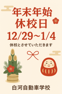 2025年12月28日 / 最終更新日時 : 2025年12月28日 白河自動車学校 お知らせ 年末年始の営業について 年末年始の営業時間についてのご案内でございます。 本年も大変お世話になりました。 来年もよろしくお願いいたします。
